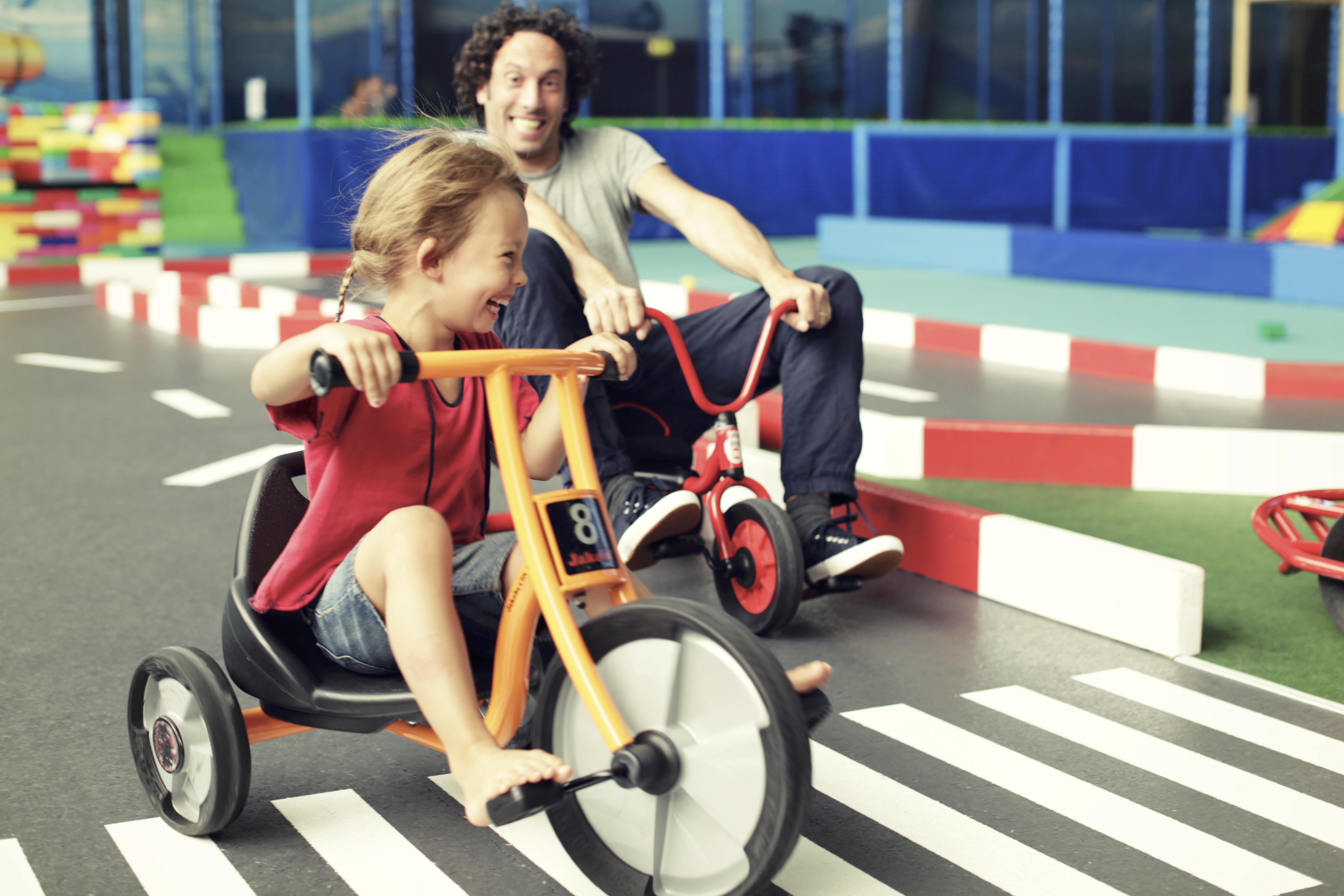 A large indoor play area with climbing tower, trampoline and games.